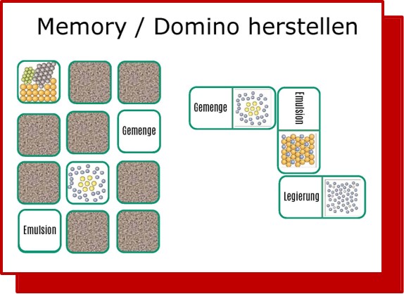 Während bei den bekannten Gesellschaftsspielen immer "gleich zu gleich" gesucht bzw. angelegt wird, werden im naturwissenschaftlichen Unterricht (oder auch in anderen Sachfächern und der Mathematik) Kärtchen mit gleichem Inhalt aber verschiedener Kodierung als Paare betrachtet, also z.B. die Formel eines Stoffes und sein Name oder die Abbildung einer Pflanze und ihre Bezeichnung. Besonders bei Chemie und Physik steht so die Übersetzung zwischen verschiedenen Darstellungsformen im Vordergrund. Damit dienen Memory und Domino nicht nur der Wiederholung von zuvor angeeignetem Wissen, sondern auch dem Kompetenzerwerb in der Fachsprache.