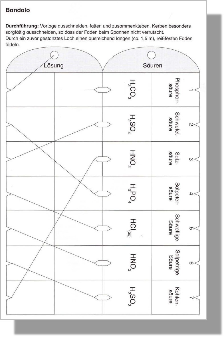 Bandolos sind insbesondere im Grundschulbereich verbreitet, eignen sich aber auch für die Anfangsklassen der Mittelstufe. Die zuzu- Zur Kontrolle ist die korrekte Fadenführung auf der Rück- Quelle: SINUS Naturwissen-schaften (Bayern und Hessen): Säuren – Laugen – Salze. Reaktionsgleichungen aufstellen.