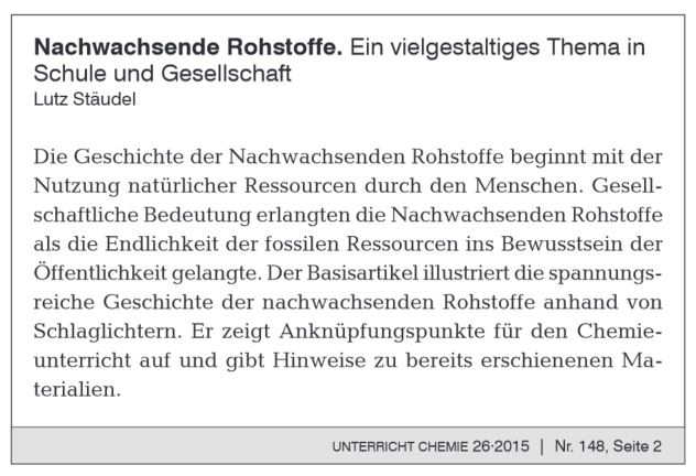 L. Stäudel: Nachwachsende Rohstoffe. Ein vielgestaltiges Thema in Schule und Gesellschaft: In. Unterricht Chemie, 26. Jh., H. 148 (2015), S. 2 – 6 |