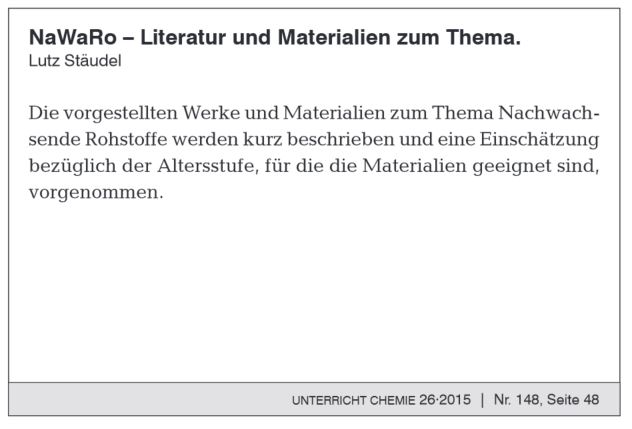 L. Stäudel: NaWaRo – Literatur und Materialien zum Thema. In. Unterricht Chemie, 26. Jh., H. 148 (2015), S. 48 |